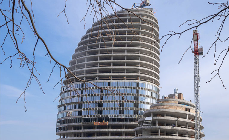 - At tower "G", work in progrress on the installation of aluminum window structures and the installation of hinged ventilated facades of 9-16 floors. Bricklaying works are being carried out on the floors 12-16. Facade lighting works have begun.