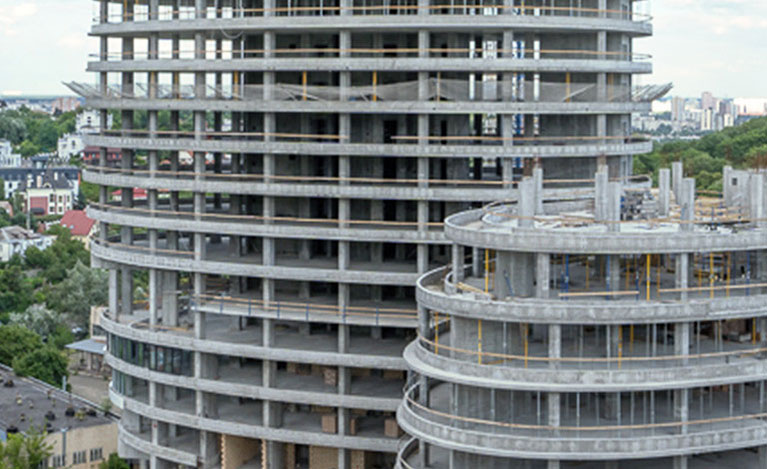 На башне "В" продолжается устройство железобетонных парапетов.