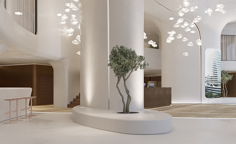 Для изысканной архитектурной эстетики и рационального использования площади лобби спроектировано в два яруса, что создает чувство пространства и легкости. Панорамные окна заполнят зал естественным светом, подчеркивая элегантность интерьера. Отдельное внимание уделено лифтовой зоне: премиальные лифты KONE с эксклюзивным дизайнерским оформлением станут воплощением технологического совершенства, подчеркивая статус smart-пространства с инновационной концепцией.